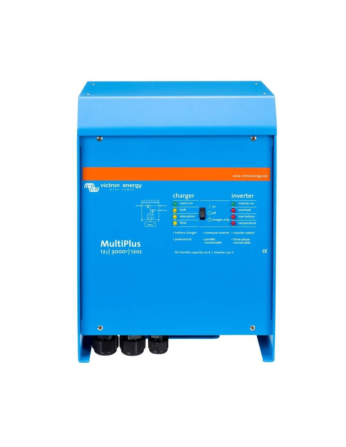 L'inverseur de charge MultiPlus 12/3000/120 regroupe dans son boîtier compact, un réacteur sinusoïdal résistant de 2500W (puissance de pointe 6000W) pour les systèmes de batterie 12V, un chargeur de batterie avec une technologie sophistiquée variable de 120 A et un commutateur de transfert de courant alternatif à grande vitesse de 16 A