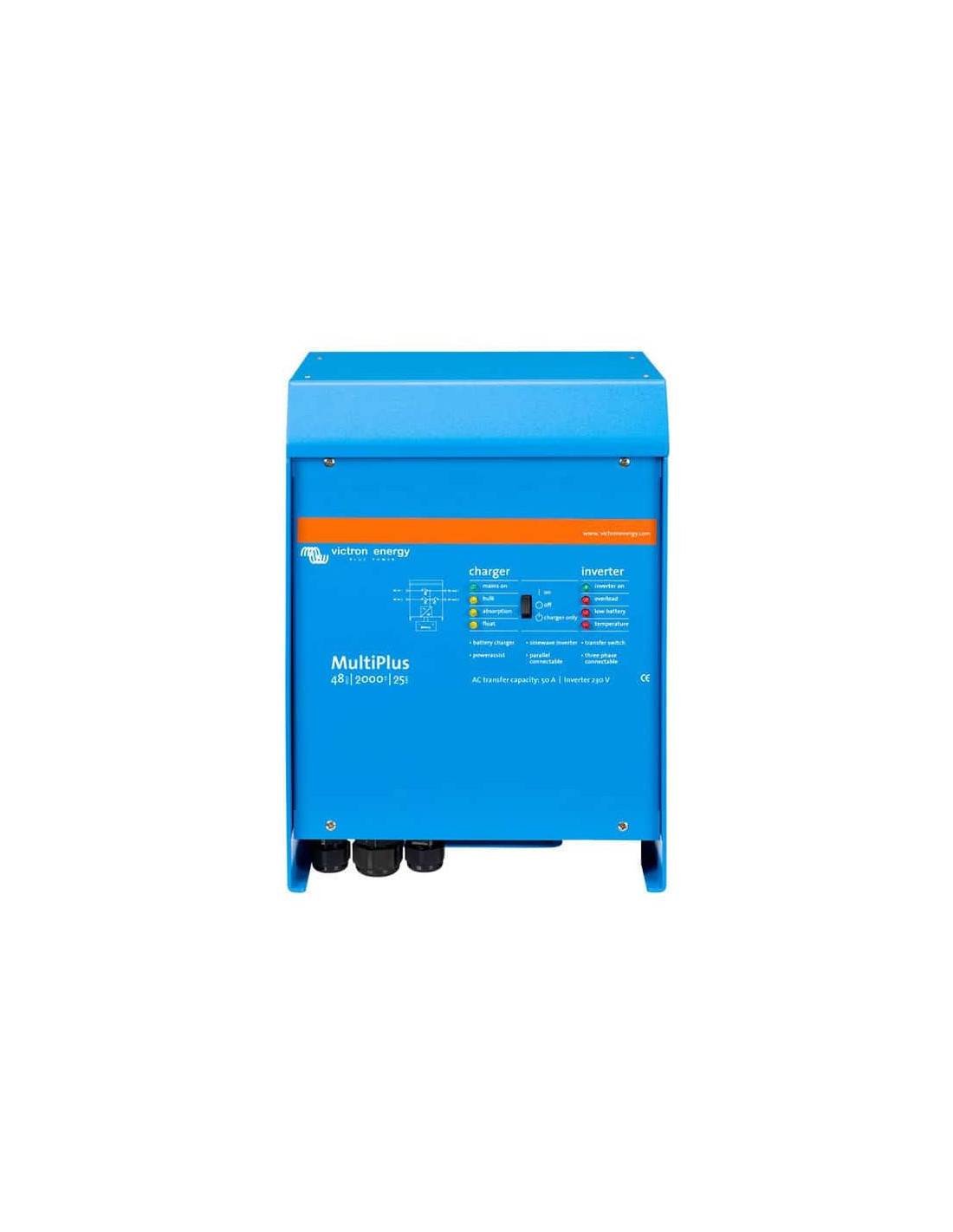 El Inversor Cargador solar MultiPlus 48/2000/25-32 agrupa en su compacta carcasa, un resistente inversor sinusoidal de 1600W (Potencia pico 3500W) para sistemas de baterías de 48V, un cargador de baterías solares con una sofisticada tecnología variable de 25A y un conmutador de transferencia de corriente alterna de alta velocidad de 32A