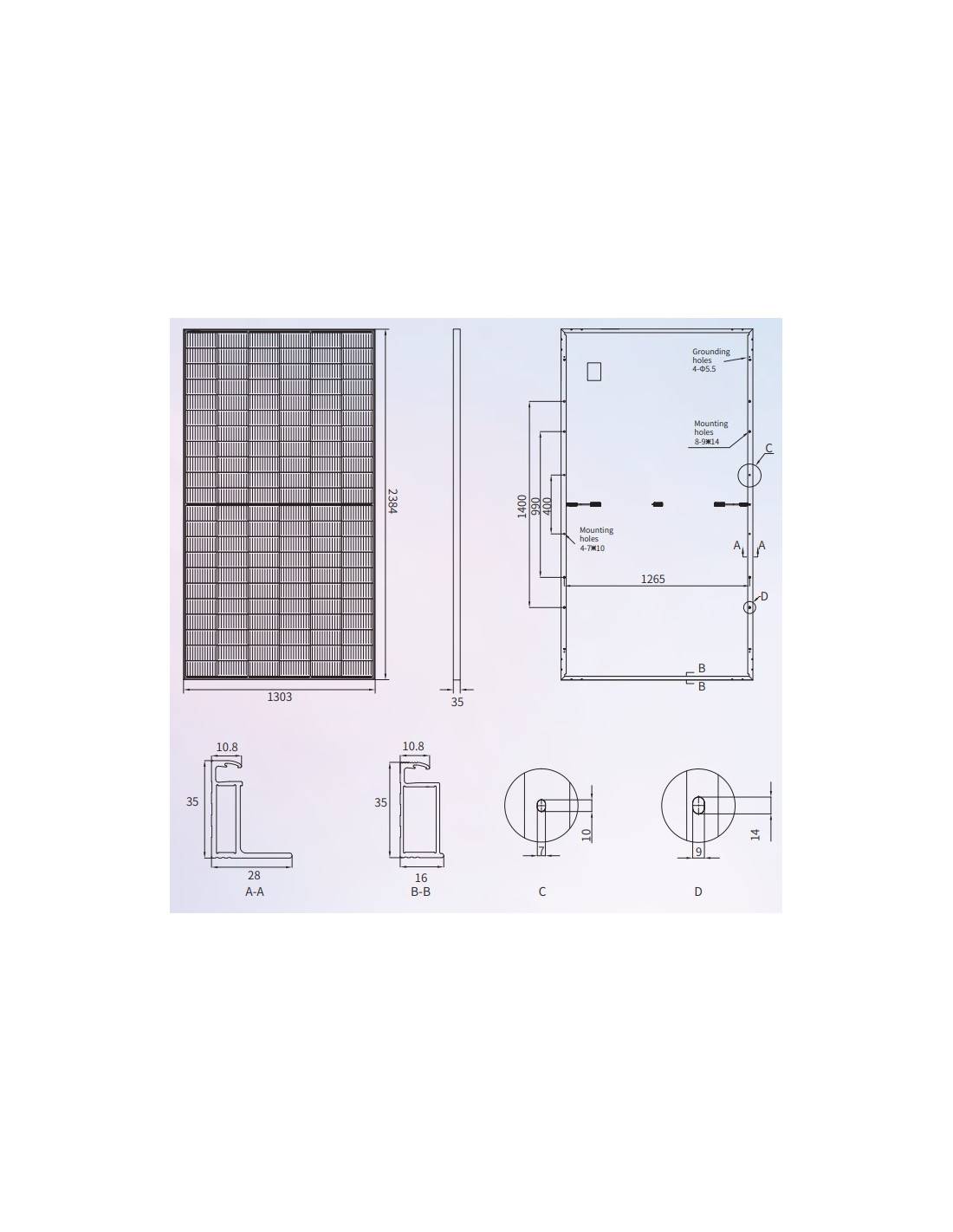 - - Placa solar capaz de soportar altas cargas mecánicas estáticas-nieve de hasta (5400Pa) y dinámicas-viento de 2400Pa. Certificado en sistemas anti-incendios.