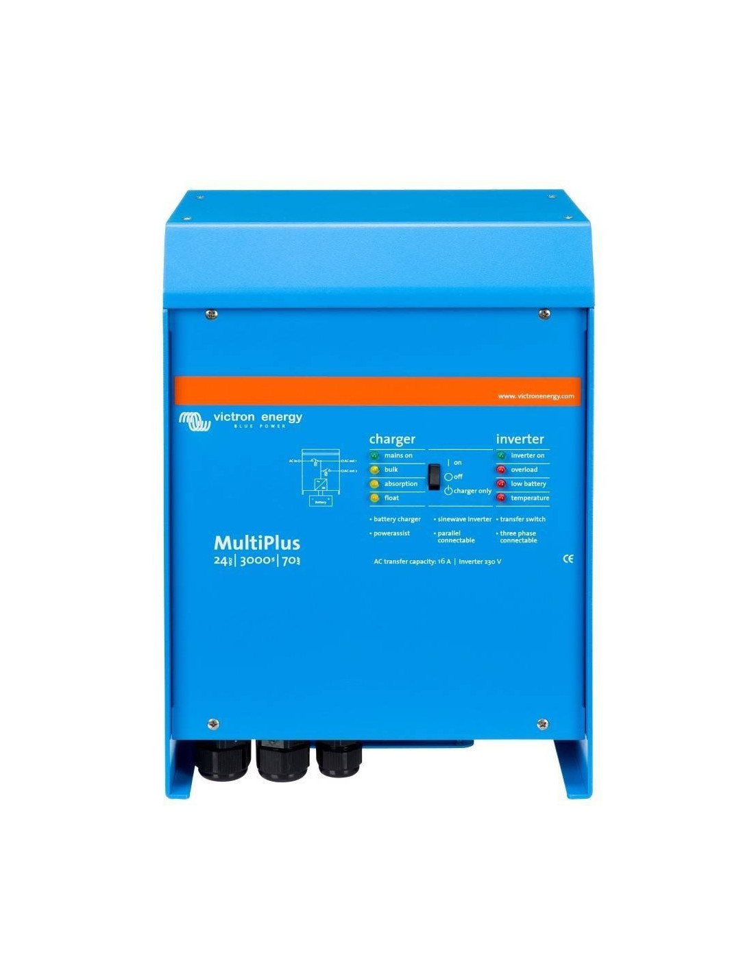 O Inversor Carregador MultiPlus 24/3000/70-16 reúne na sua caixa compacta, um resistente inversor sinusoidal de 2500W (Pico de potência 6000W) para sistemas de baterias de 24V, um carregador de baterias com uma sofisticada tecnologia variável de 70A e um comutador de transferência de corrente alternada de alta velocidade de 16A