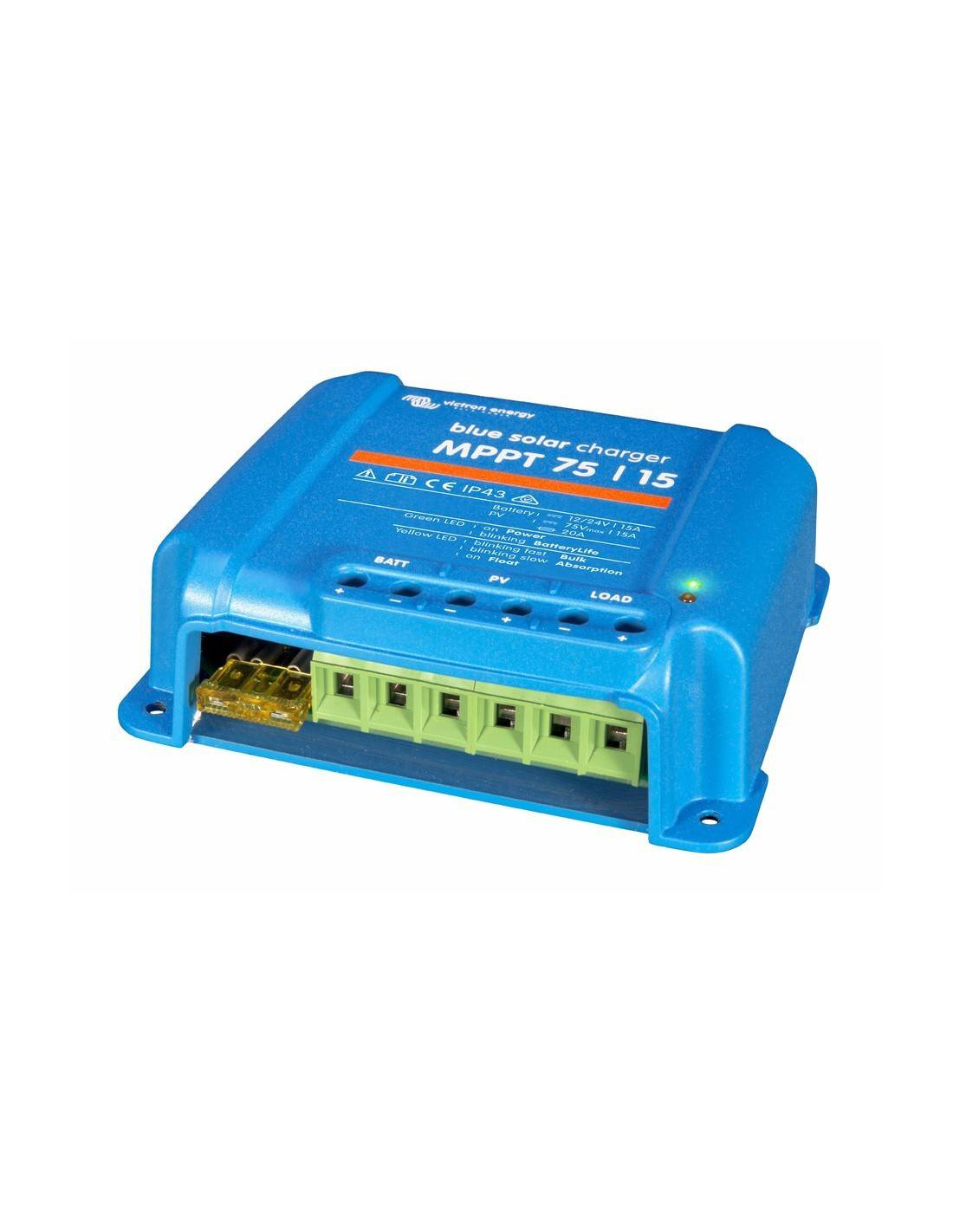 O regulador BlueSolar MPPT 75/15 de Victron é um dos reguladores mais optimizados, tanto na gestão da carga da bateria como na maximização da energia extraída do painel solar.